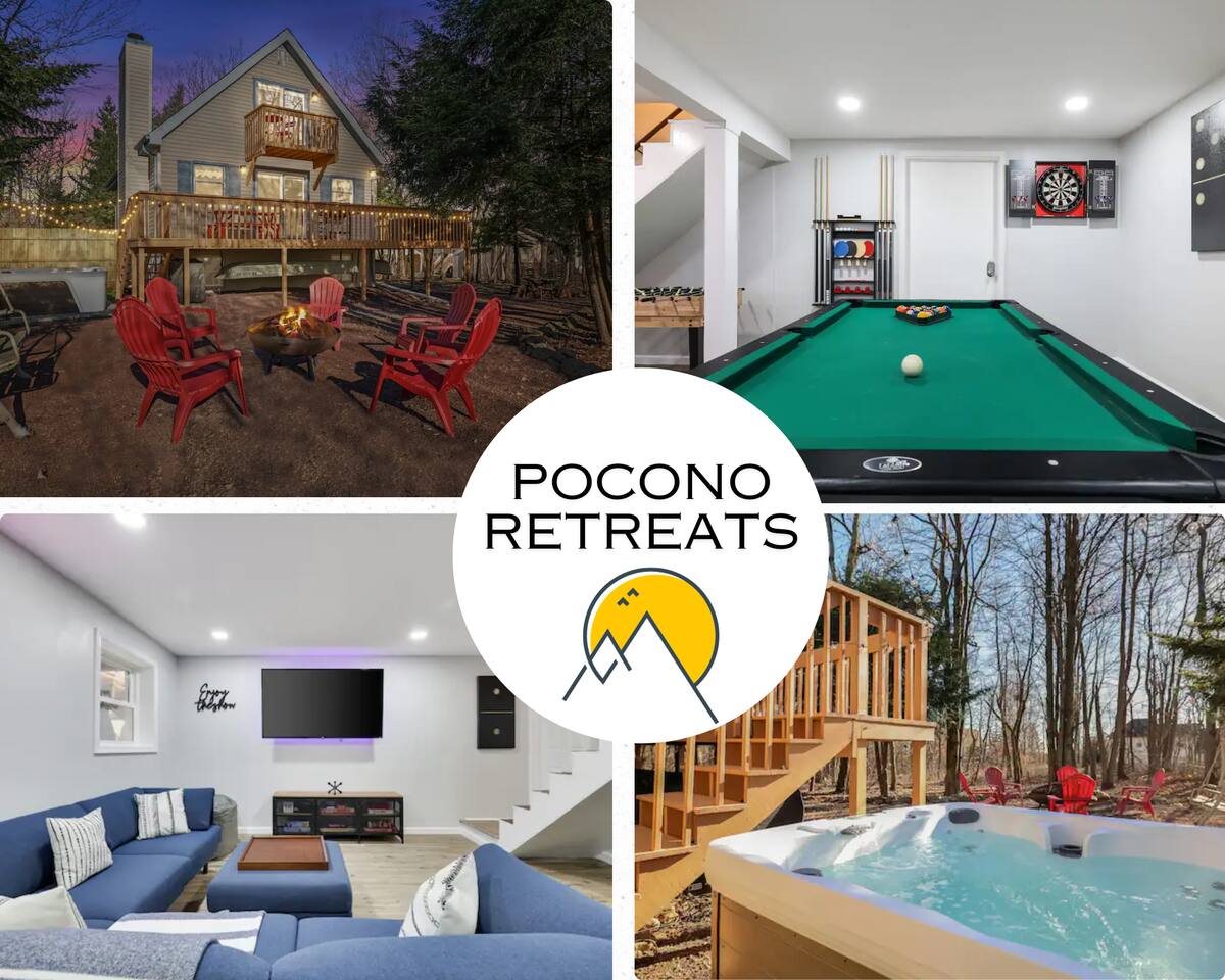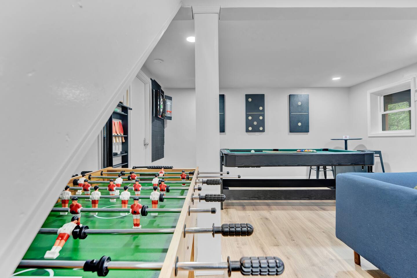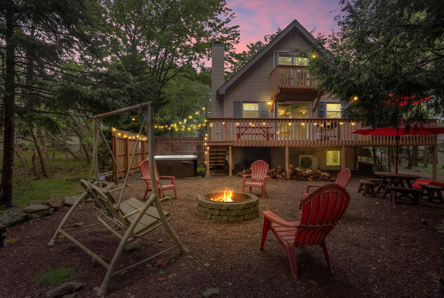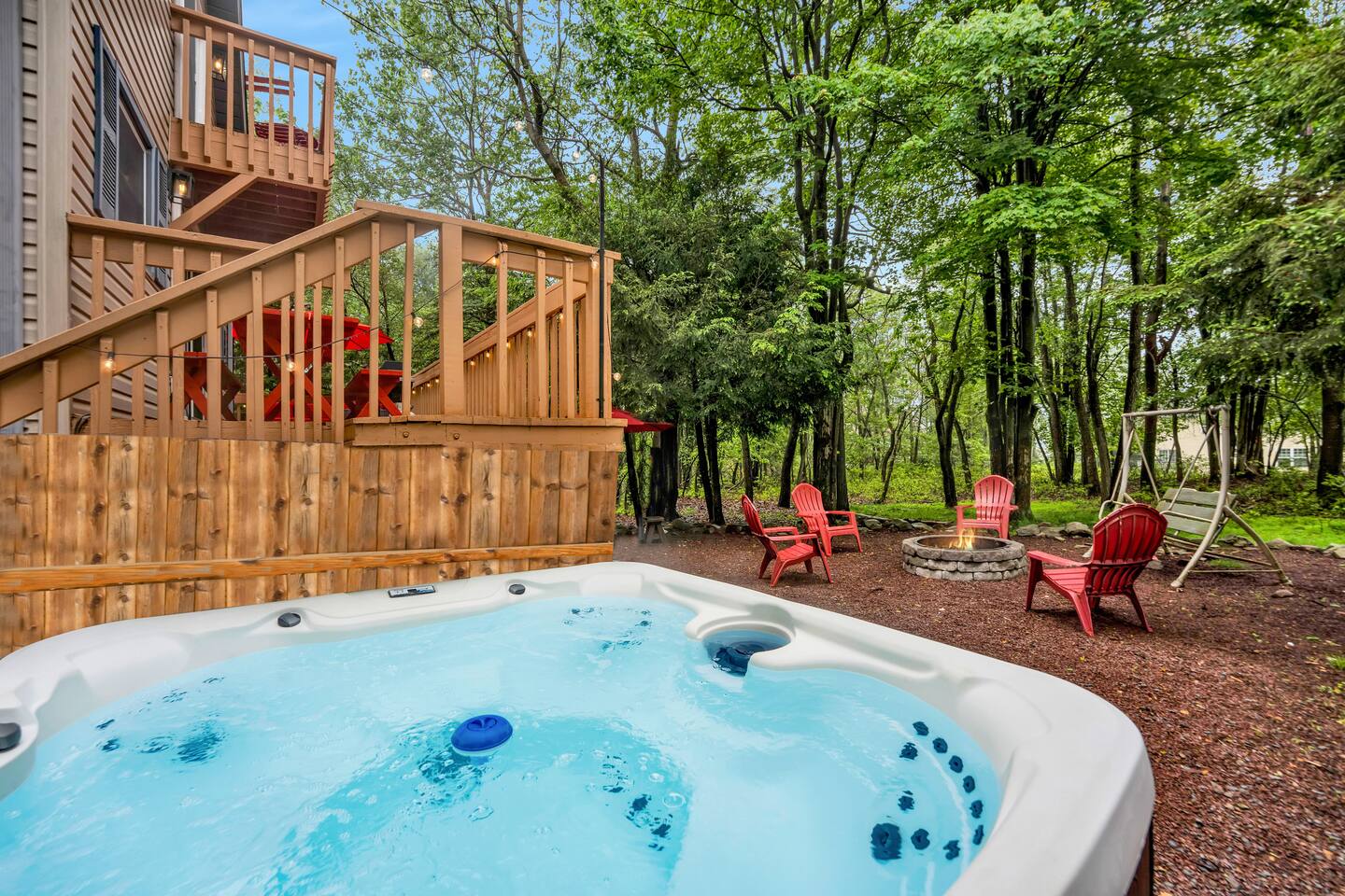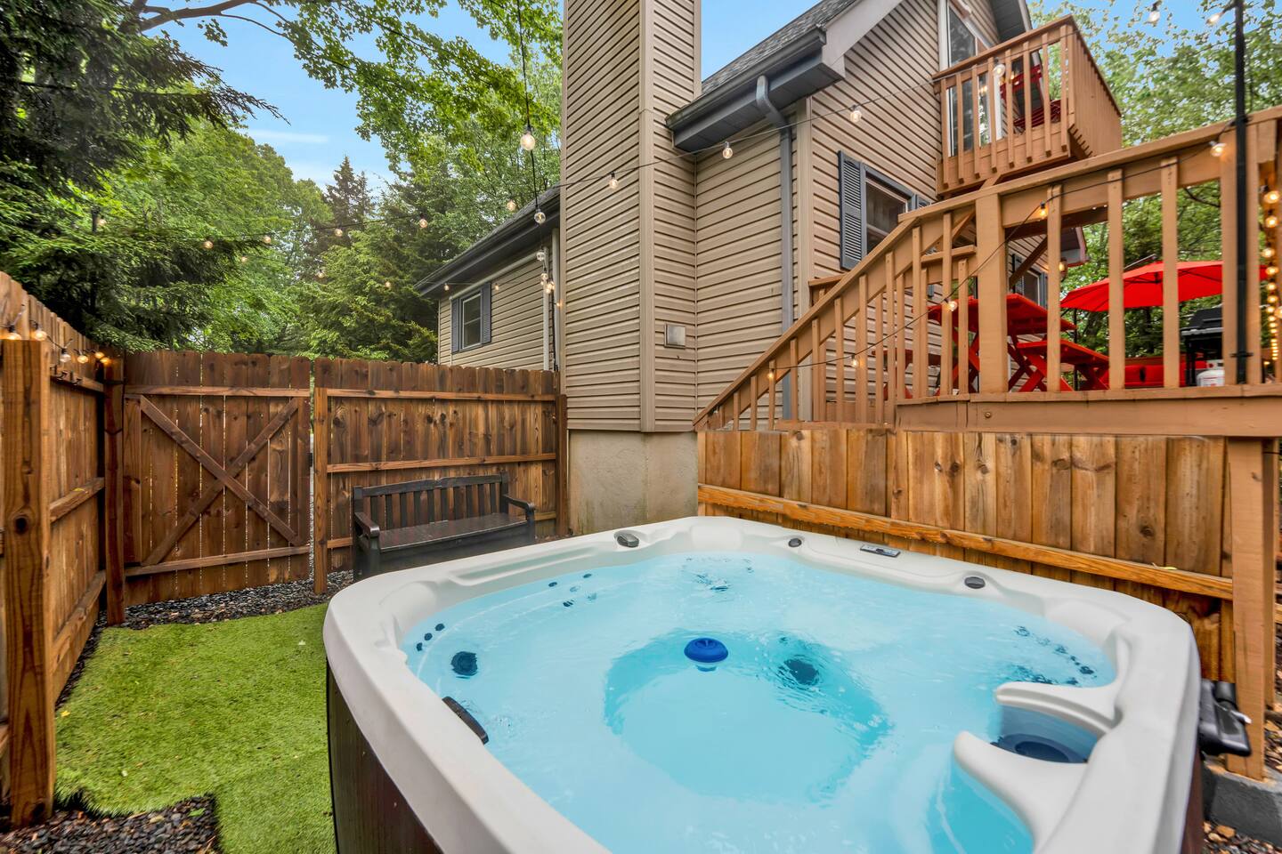 ★LOCATION We are located near Kalahari Indoor Water Park, Camelback Ski Mountain , Mount Airy Casino and the Pocono Raceway! ★KITCHEN Fully equipped w/ cooking basics, dishes & utensils, electric stove, dishwasher, Keurig duo coffee maker, tea kettle, toaster and blender. Fully stocked coffee station. ★ LIVING ROOM Cozy living room with a sectional and loveseat. 55" SmartTV. Electric Fireplace. ★ DINING Expandable dining table ★ GAME ROOM Located on the ground level. The game room features a 3 in 1 multi game table (Pool, Ping Pong& Air Hockey), darts, foosball table and plenty of board games. Comfy sectional, bean bags and a 65" Smart TV. ★OUTDOOR Deck with lounging couches, picnic table & propane grill. Hot tub Fire pit ★ BEDROOMS BEDROOM 1 - (1) Queen Bed, 26” Smart TV + Dresser + Desk BEDROOM 2 - (1) KING Bed + (1) Twin Bed with Trundle + Balcony BEDROOM 3 - (1) Queen Bed + (1) Twin Bed with Trundle BONUS BUNK AREA - (2) Twin over Twin Bunk Beds + Dresser ★ PARKING Driveway in front of property can fit up to 6 cars ★ FEATURES Smart TVs High Speed Internet Wifi (1.2 GB) Smart Lock for Keyless entry BBQ Propane Grill Electric FirePlace Washer and Dryer (Available upon request) Hairdryer Linens | Towels Body Wash | Shampoo| Conditioner | Toilet Paper Dish Soap | Paper Towels | Cleaning supplies
