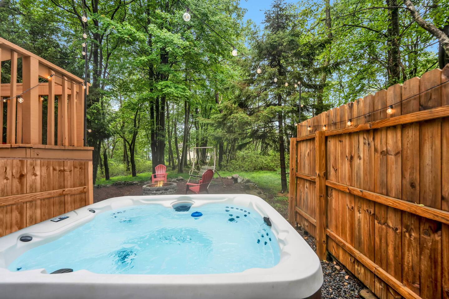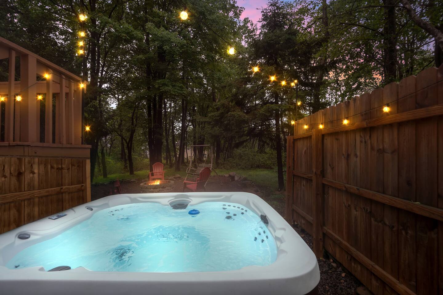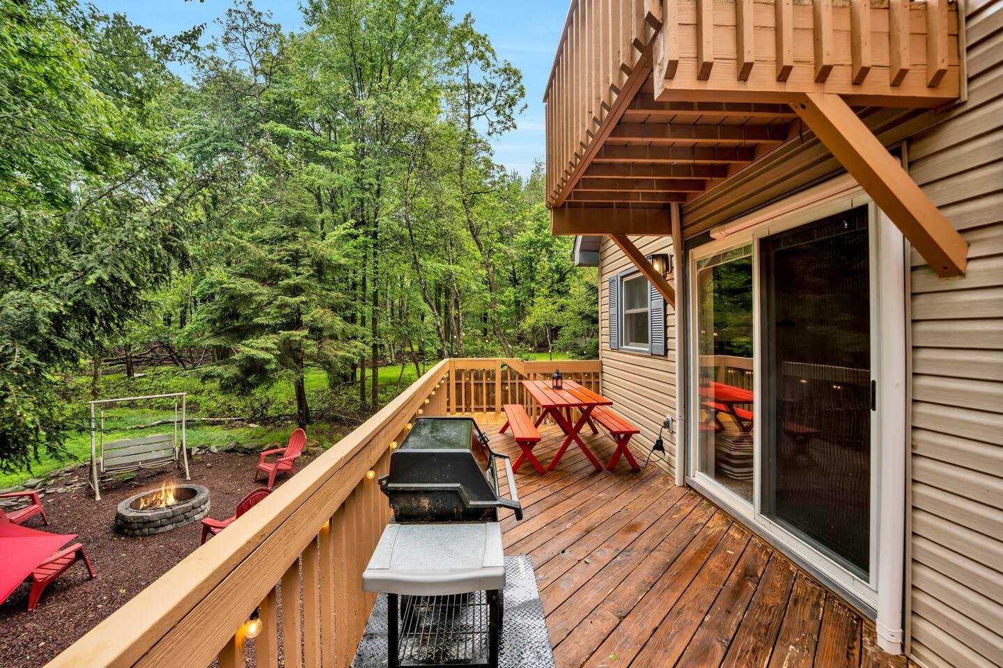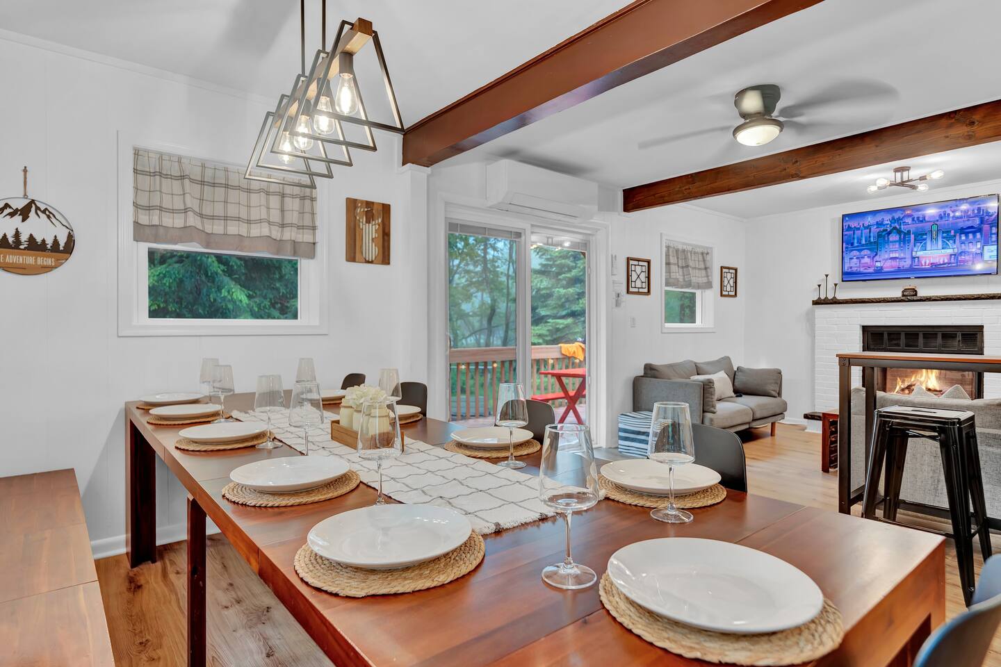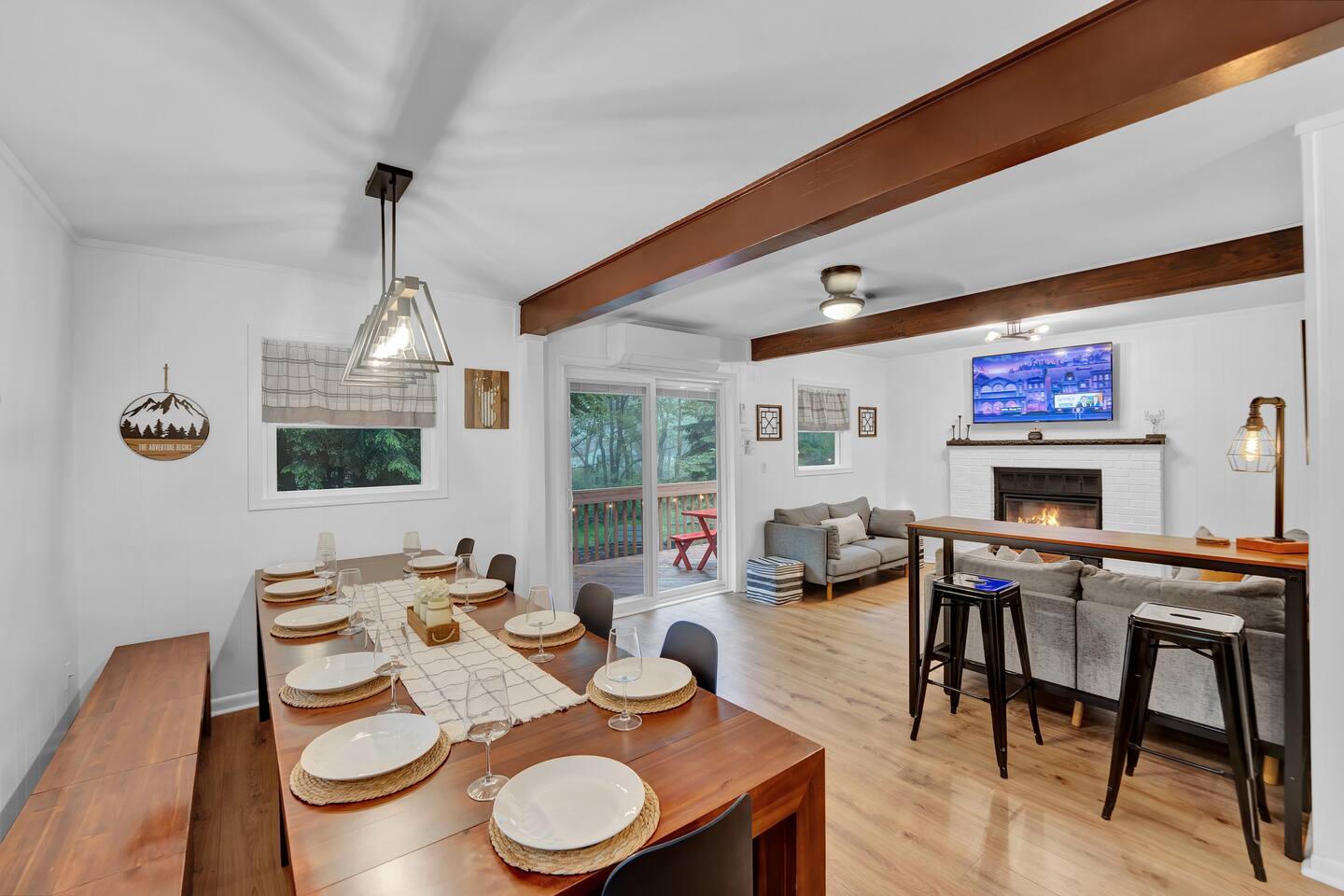 ★LOCATION We are located near Kalahari Indoor Water Park, Camelback Ski Mountain , Mount Airy Casino and the Pocono Raceway! ★KITCHEN Fully equipped w/ cooking basics, dishes & utensils, electric stove, dishwasher, Keurig duo coffee maker, tea kettle, toaster and blender. Fully stocked coffee station. ★ LIVING ROOM Cozy living room with a sectional and loveseat. 55" SmartTV. Electric Fireplace. ★ DINING Expandable dining table ★ GAME ROOM Located on the ground level. The game room features a 3 in 1 multi game table (Pool, Ping Pong& Air Hockey), darts, foosball table and plenty of board games. Comfy sectional, bean bags and a 65" Smart TV. ★OUTDOOR Deck with lounging couches, picnic table & propane grill. Hot tub Fire pit ★ BEDROOMS BEDROOM 1 - (1) Queen Bed, 26” Smart TV + Dresser + Desk BEDROOM 2 - (1) KING Bed + (1) Twin Bed with Trundle + Balcony BEDROOM 3 - (1) Queen Bed + (1) Twin Bed with Trundle BONUS BUNK AREA - (2) Twin over Twin Bunk Beds + Dresser ★ PARKING Driveway in front of property can fit up to 6 cars ★ FEATURES Smart TVs High Speed Internet Wifi (1.2 GB) Smart Lock for Keyless entry BBQ Propane Grill Electric FirePlace Washer and Dryer (Available upon request) Hairdryer Linens | Towels Body Wash | Shampoo| Conditioner | Toilet Paper Dish Soap | Paper Towels | Cleaning supplies
