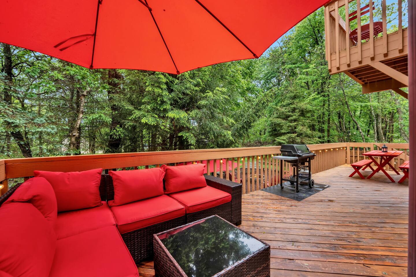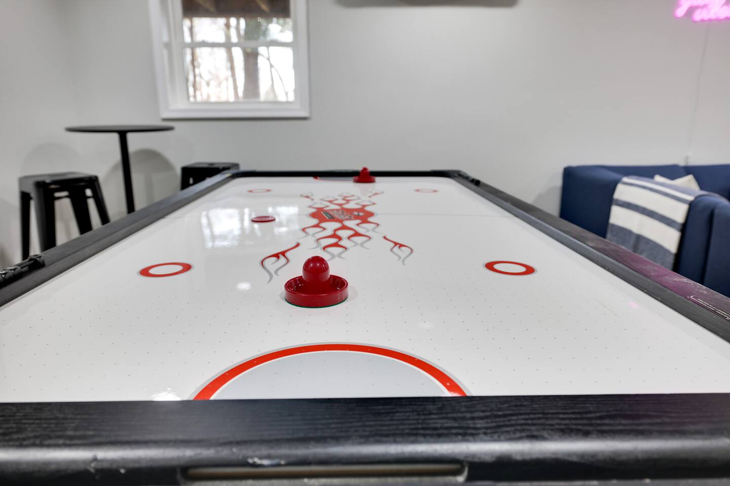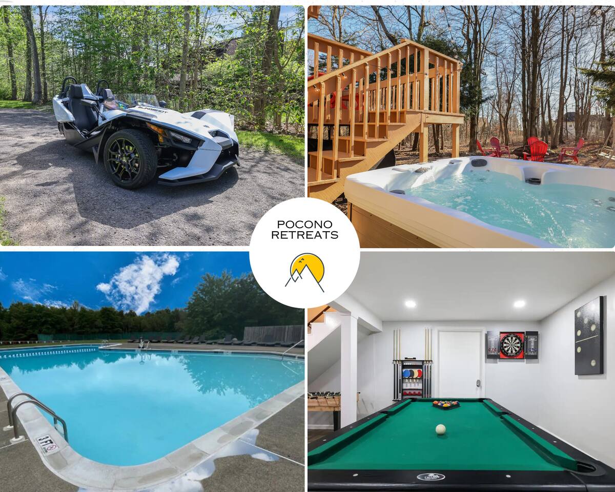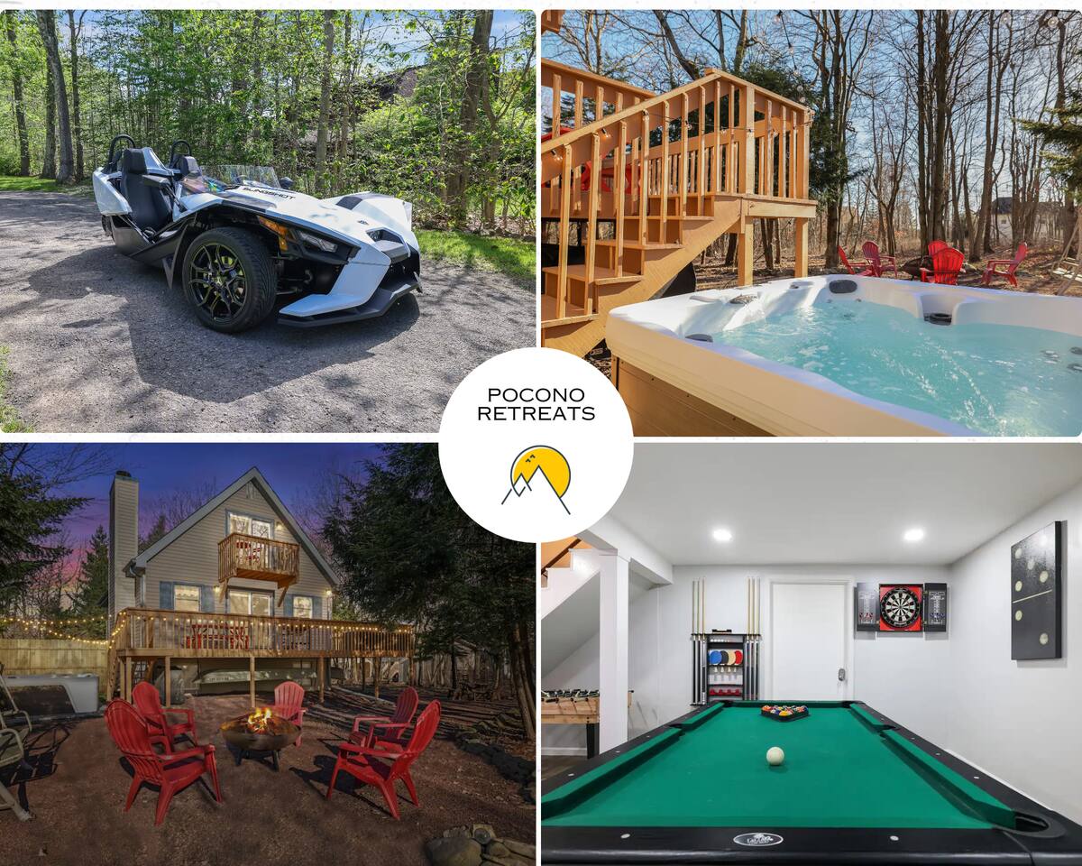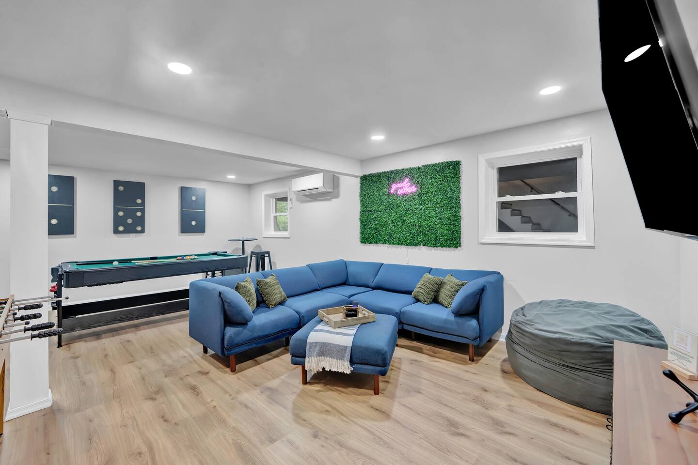 ★LOCATION We are located near Kalahari Indoor Water Park, Camelback Ski Mountain , Mount Airy Casino and the Pocono Raceway! ★KITCHEN Fully equipped w/ cooking basics, dishes & utensils, electric stove, dishwasher, Keurig duo coffee maker, tea kettle, toaster and blender. Fully stocked coffee station. ★ LIVING ROOM Cozy living room with a sectional and loveseat. 55" SmartTV. Electric Fireplace. ★ DINING Expandable dining table ★ GAME ROOM Located on the ground level. The game room features a 3 in 1 multi game table (Pool, Ping Pong& Air Hockey), darts, foosball table and plenty of board games. Comfy sectional, bean bags and a 65" Smart TV. ★OUTDOOR Deck with lounging couches, picnic table & propane grill. Hot tub Fire pit ★ BEDROOMS BEDROOM 1 - (1) Queen Bed, 26” Smart TV + Dresser + Desk BEDROOM 2 - (1) KING Bed + (1) Twin Bed with Trundle + Balcony BEDROOM 3 - (1) Queen Bed + (1) Twin Bed with Trundle BONUS BUNK AREA - (2) Twin over Twin Bunk Beds + Dresser ★ PARKING Driveway in front of property can fit up to 6 cars ★ FEATURES Smart TVs High Speed Internet Wifi (1.2 GB) Smart Lock for Keyless entry BBQ Propane Grill Electric FirePlace Washer and Dryer (Available upon request) Hairdryer Linens | Towels Body Wash | Shampoo| Conditioner | Toilet Paper Dish Soap | Paper Towels | Cleaning supplies