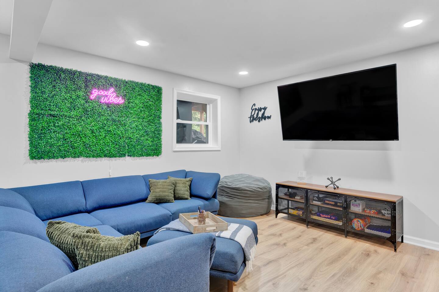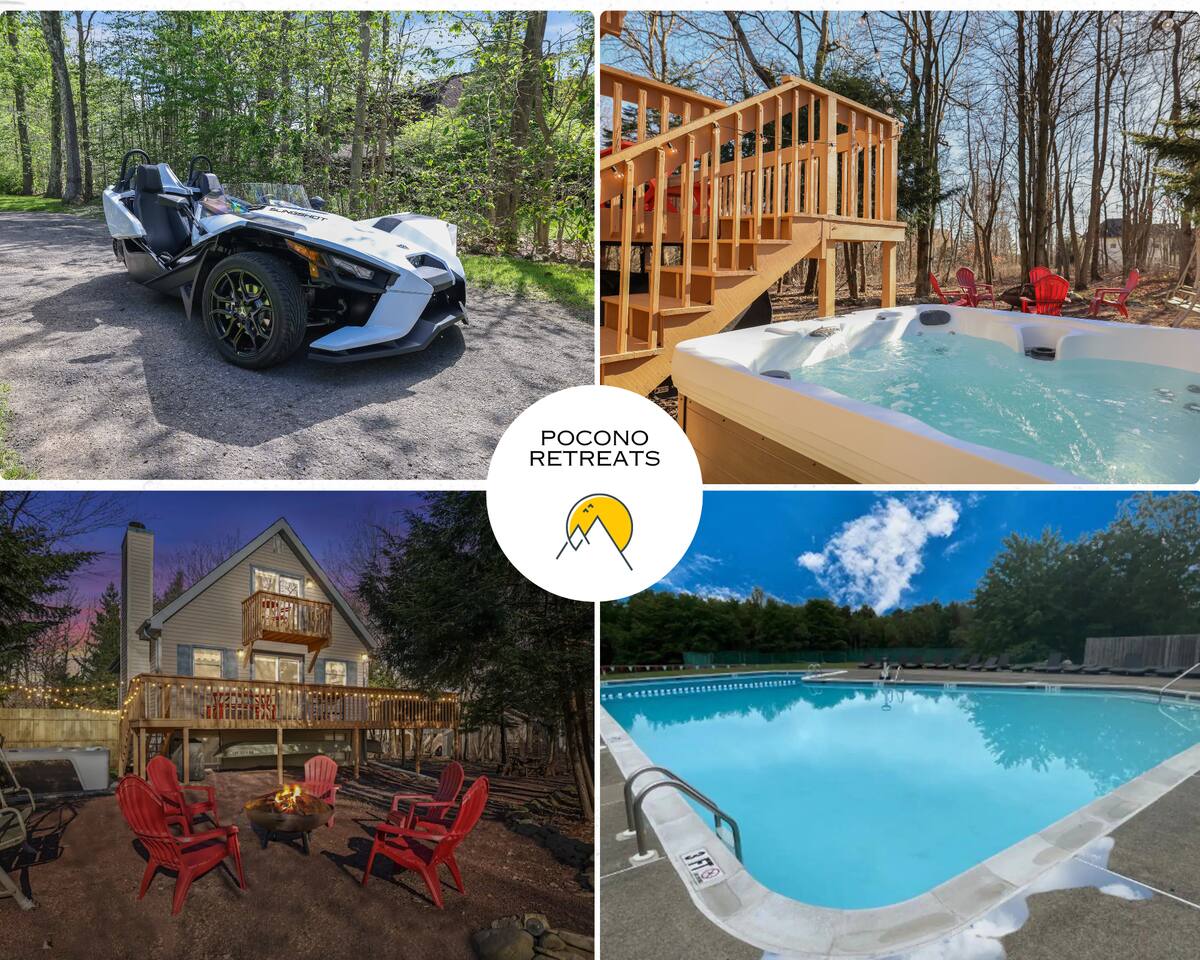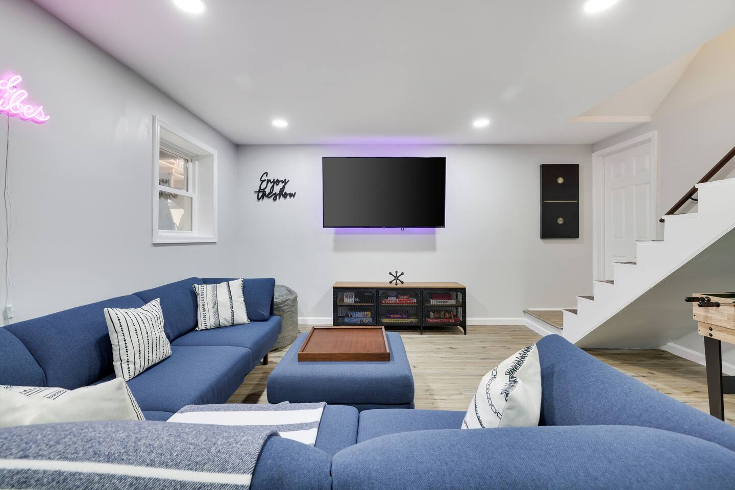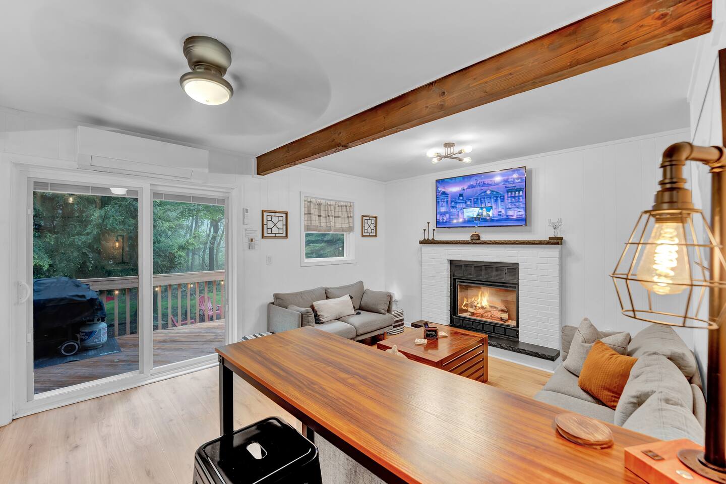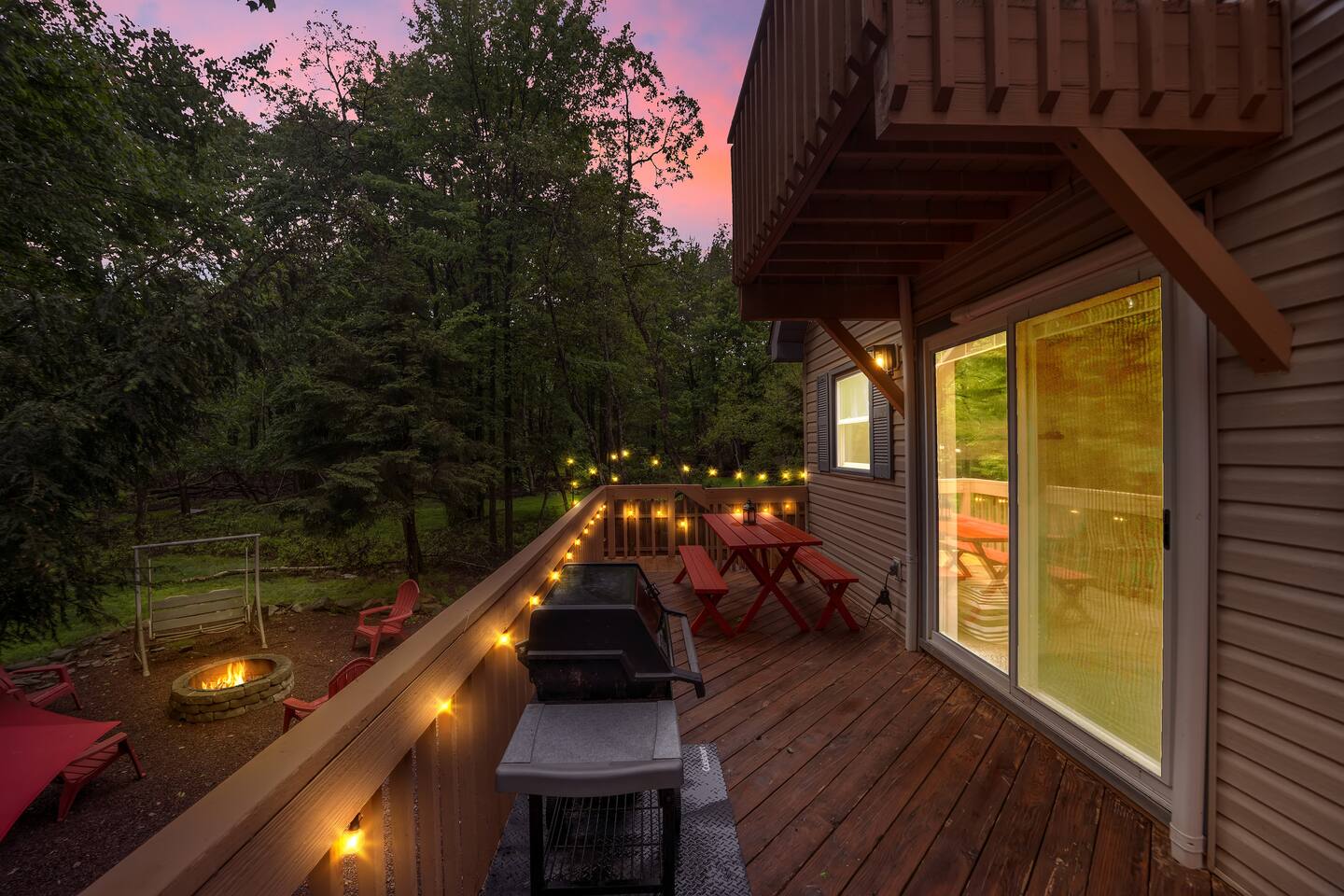 ★LOCATION We are located near Kalahari Indoor Water Park, Camelback Ski Mountain , Mount Airy Casino and the Pocono Raceway! ★KITCHEN Fully equipped w/ cooking basics, dishes & utensils, electric stove, dishwasher, Keurig duo coffee maker, tea kettle, toaster and blender. Fully stocked coffee station. ★ LIVING ROOM Cozy living room with a sectional and loveseat. 55" SmartTV. Electric Fireplace. ★ DINING Expandable dining table ★ GAME ROOM Located on the ground level. The game room features a 3 in 1 multi game table (Pool, Ping Pong& Air Hockey), darts, foosball table and plenty of board games. Comfy sectional, bean bags and a 65" Smart TV. ★OUTDOOR Deck with lounging couches, picnic table & propane grill. Hot tub Fire pit ★ BEDROOMS BEDROOM 1 - (1) Queen Bed, 26” Smart TV + Dresser + Desk BEDROOM 2 - (1) KING Bed + (1) Twin Bed with Trundle + Balcony BEDROOM 3 - (1) Queen Bed + (1) Twin Bed with Trundle BONUS BUNK AREA - (2) Twin over Twin Bunk Beds + Dresser ★ PARKING Driveway in front of property can fit up to 6 cars ★ FEATURES Smart TVs High Speed Internet Wifi (1.2 GB) Smart Lock for Keyless entry BBQ Propane Grill Electric FirePlace Washer and Dryer (Available upon request) Hairdryer Linens | Towels Body Wash | Shampoo| Conditioner | Toilet Paper Dish Soap | Paper Towels | Cleaning supplies