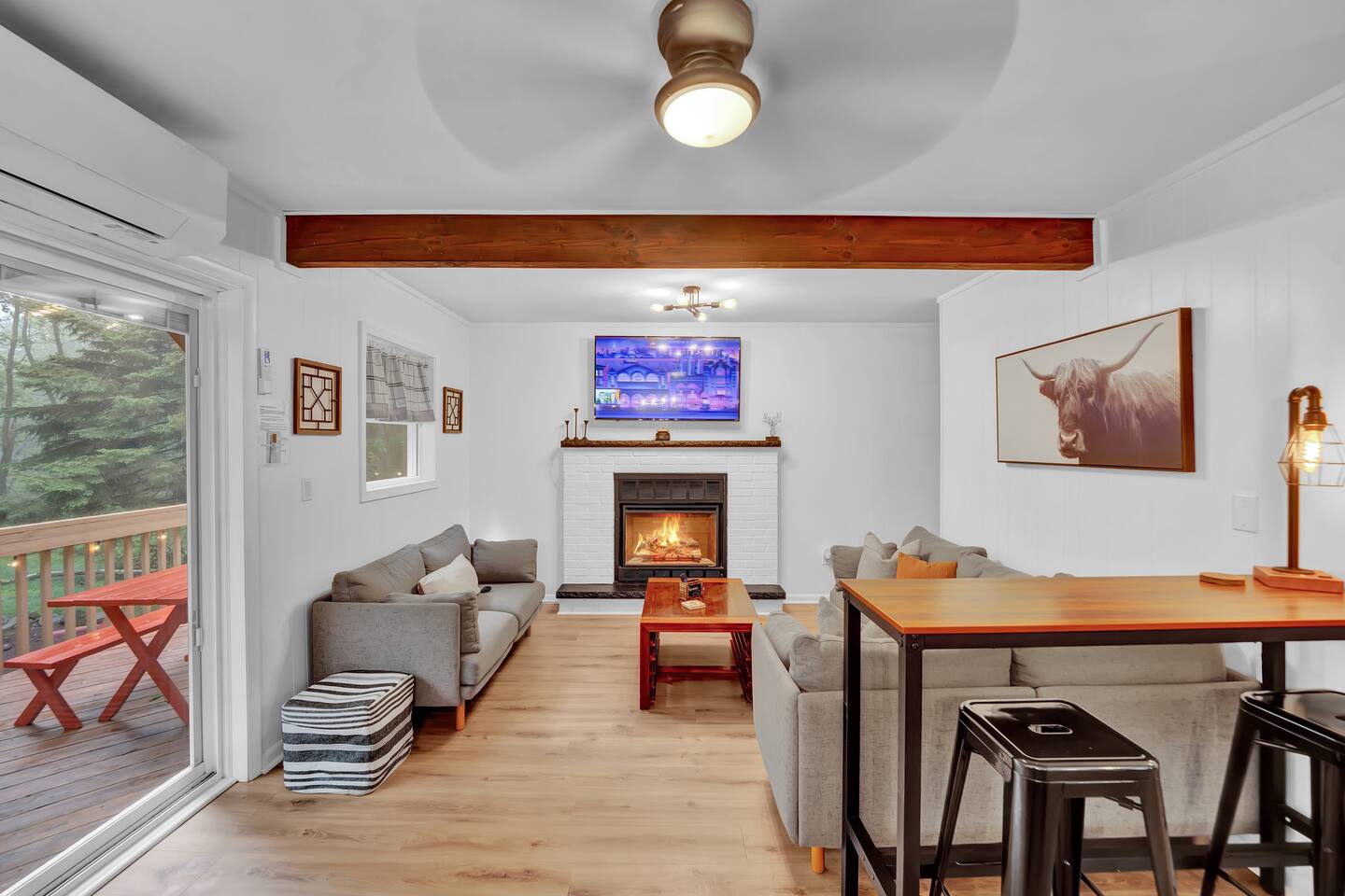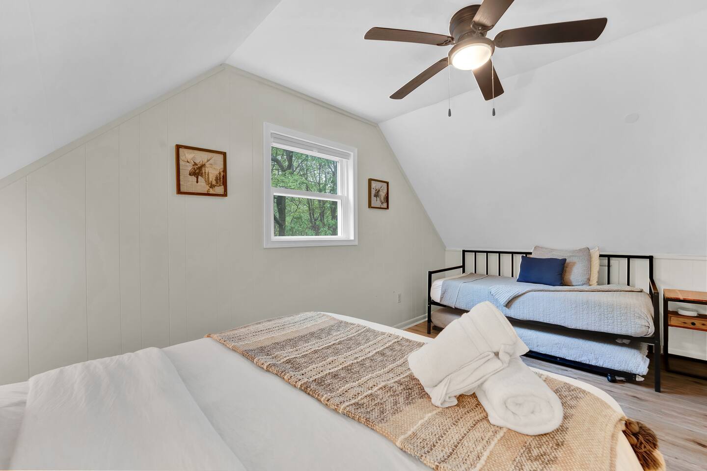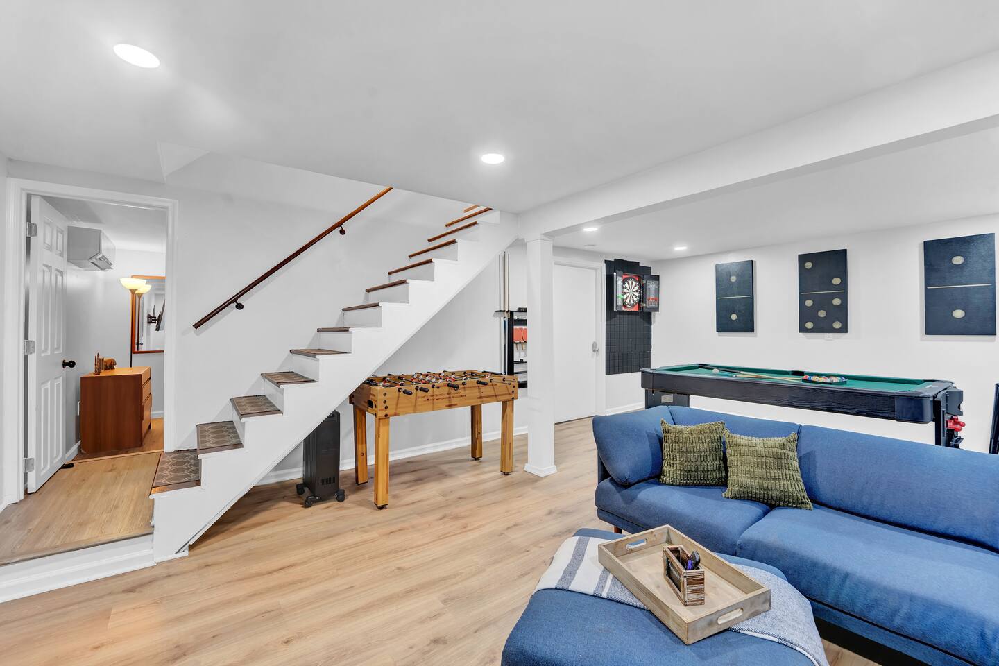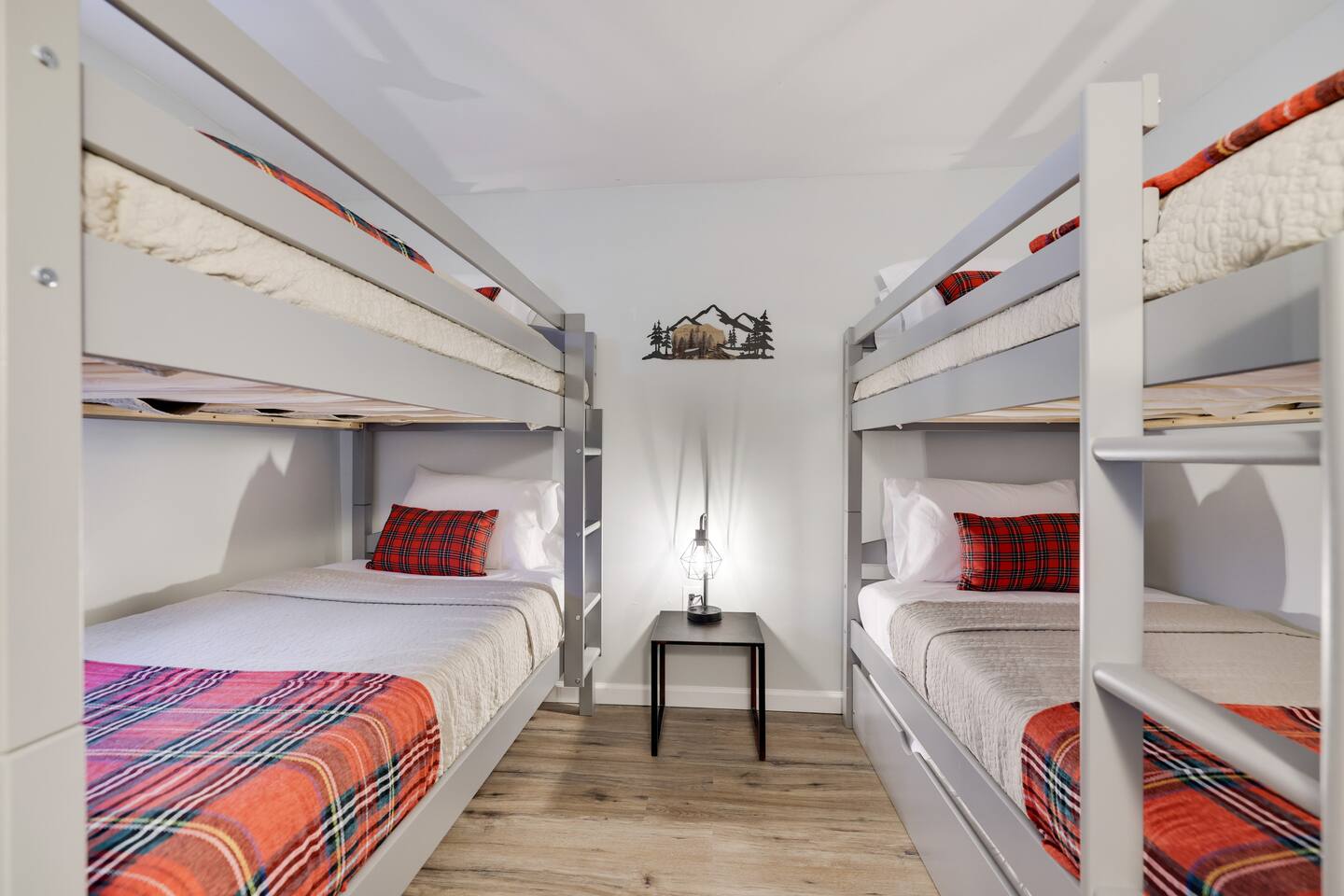 ★LOCATION We are located near Kalahari Indoor Water Park, Camelback Ski Mountain , Mount Airy Casino and the Pocono Raceway! ★KITCHEN Fully equipped w/ cooking basics, dishes & utensils, electric stove, dishwasher, Keurig duo coffee maker, tea kettle, toaster and blender. Fully stocked coffee station. ★ LIVING ROOM Cozy living room with a sectional and loveseat. 55" SmartTV. Electric Fireplace. ★ DINING Expandable dining table ★ GAME ROOM Located on the ground level. The game room features a 3 in 1 multi game table (Pool, Ping Pong& Air Hockey), darts, foosball table and plenty of board games. Comfy sectional, bean bags and a 65" Smart TV. ★OUTDOOR Deck with lounging couches, picnic table & propane grill. Hot tub Fire pit ★ BEDROOMS BEDROOM 1 - (1) Queen Bed, 26” Smart TV + Dresser + Desk BEDROOM 2 - (1) KING Bed + (1) Twin Bed with Trundle + Balcony BEDROOM 3 - (1) Queen Bed + (1) Twin Bed with Trundle BONUS BUNK AREA - (2) Twin over Twin Bunk Beds + Dresser ★ PARKING Driveway in front of property can fit up to 6 cars ★ FEATURES Smart TVs High Speed Internet Wifi (1.2 GB) Smart Lock for Keyless entry BBQ Propane Grill Electric FirePlace Washer and Dryer (Available upon request) Hairdryer Linens | Towels Body Wash | Shampoo| Conditioner | Toilet Paper Dish Soap | Paper Towels | Cleaning supplies